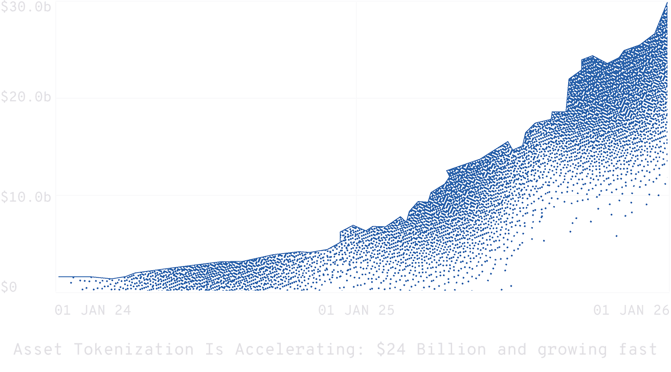 Real-world asset tokenization has grown more than 2,400% since 2024. US Treasuries, private credit, and commodities — once confined to legacy settlement systems — are now moving onto blockchain rails.