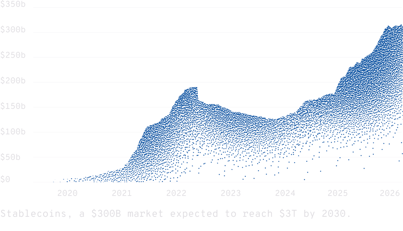 Since 2021, dollar-denominated stablecoins have grown more than 10× to over $300 billion in market cap, processing $33 trillion in transaction volume in 2025.